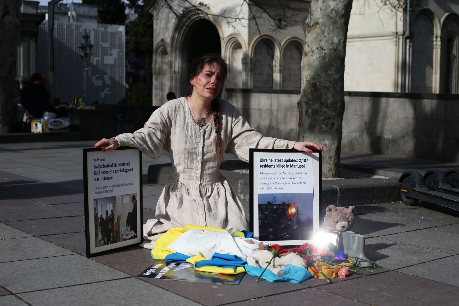 В храме Кашвети звонят колокола, и наш с Владимиром разговор прерывает появление девушки в светлом платье с нарисованными на лице следами крови. У нее на шее — христианский крест, а на плечи накинут флаг Украины. Она аккуратно расставляет на земле фоторамки с распечатанными скриншотами новостей о бомбежках Мариуполя, иконы и детские игрушки.