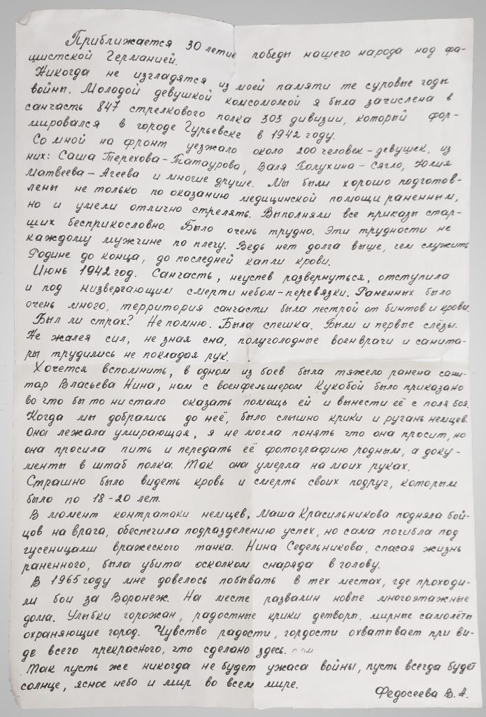 На войне ее контузило, а еще, когда она выкапывала из окопа солдата, сверху упала какая-то палка и сломала ей правую руку в двух местах. С того момента бабушка никогда не могла положить ее прямо. Рука всегда была немного скрючена, как бы лежала сверху. То письмо она написала правой рукой.
