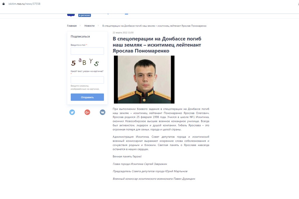 Военнослужащий из Искитима Новосибирской области Ярослав Пономаренко погиб на Донбассе, сообщает городская администрация. Молодой человек был выпускником Новосибирского высшего военного командного училища.