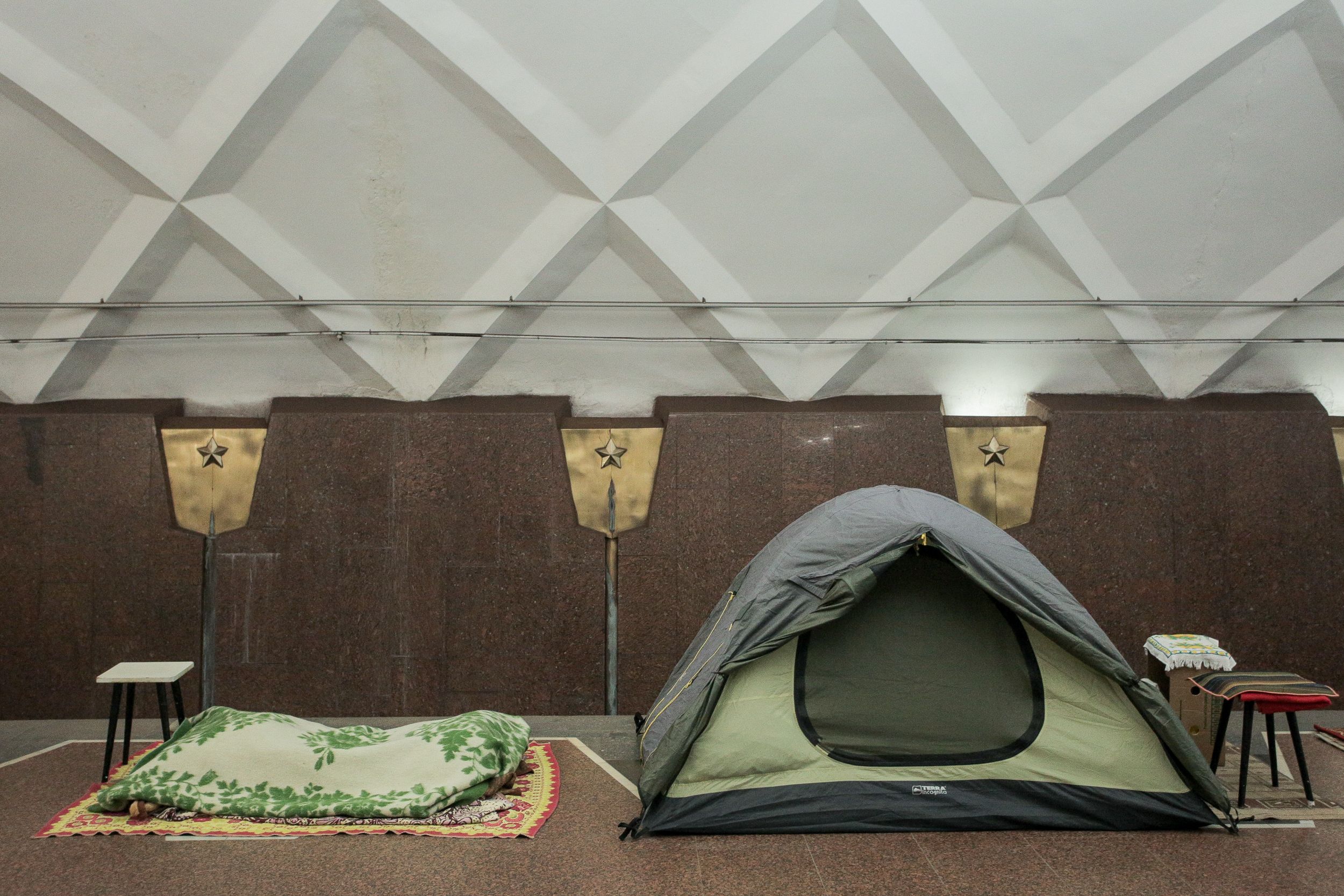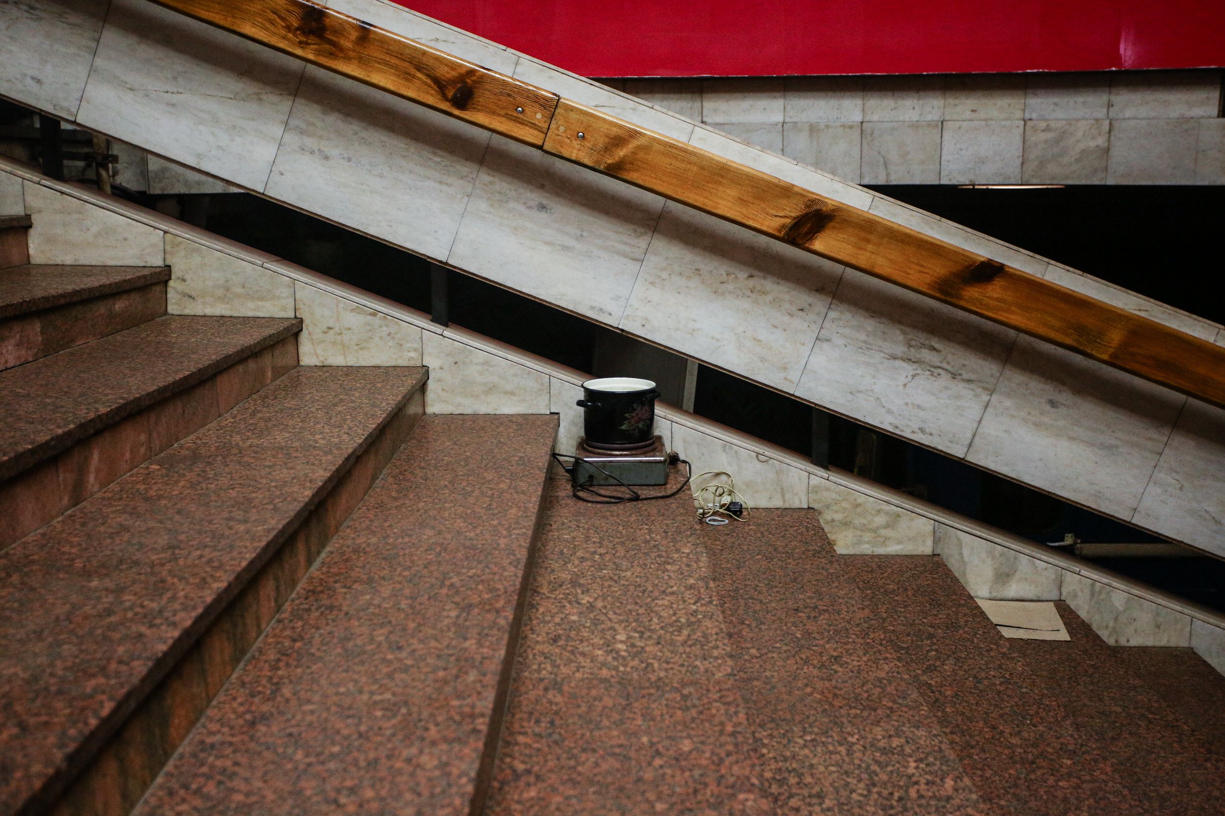 The air temperature in the station hovers around 15 degrees Celsius (59 degree Fahrenheit)Volunteers prepare most of the food available here, bringing it into the subway every day. Food is distributed to children and women first, then to everyone else. Every day, a group of men cook porridge for the children in this particular station
