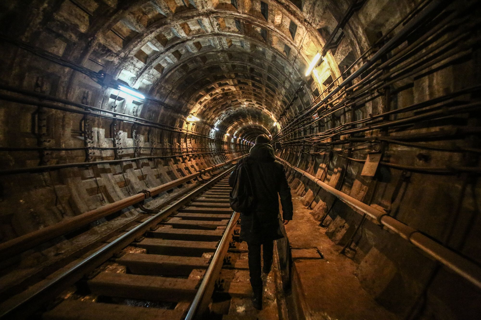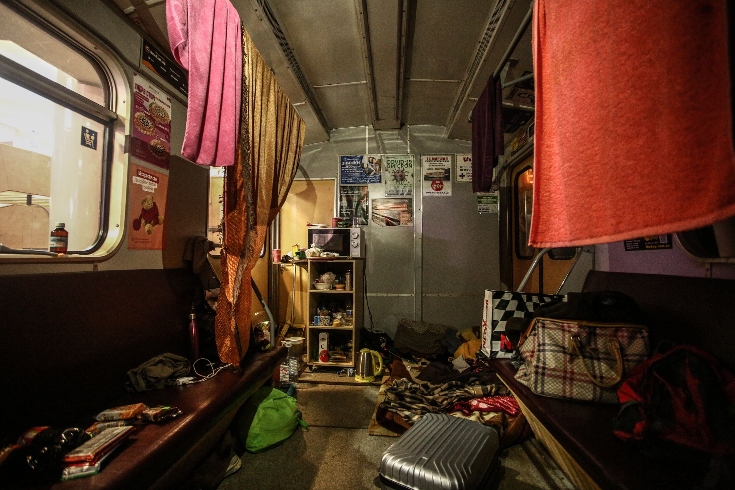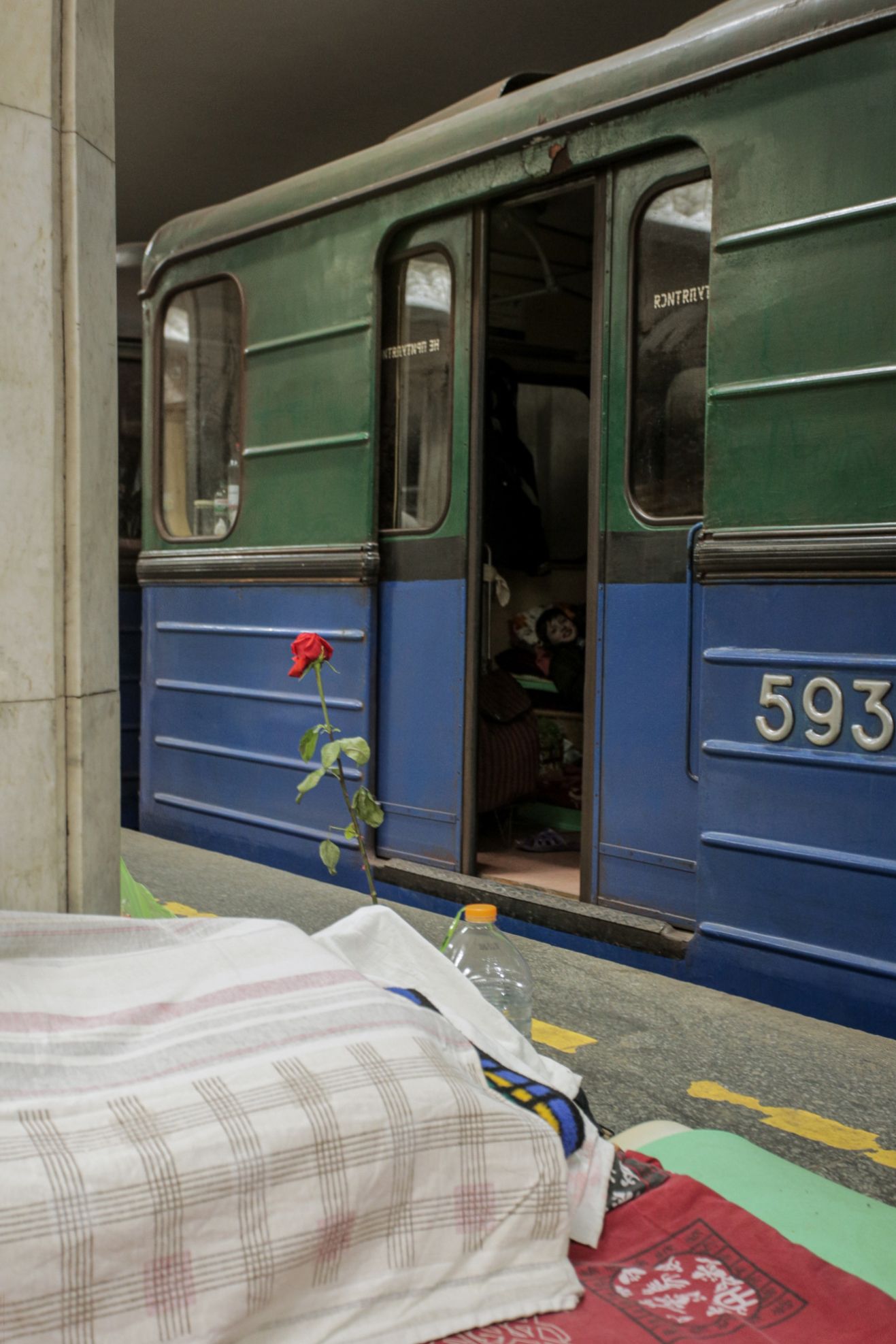 A man reads in a subway stationChildren’s drawings on display in one of Kharkiv’s subway stationsAt six o’clock in the morning, the hermetic gates open and people begin to leave the subway stations. Some head home, while others go to work. Most of them return by evening — people are afraid to stay in their home at night.A Kharkiv resident walks from one station to another through a subway tunnelNow, subway cars are used for sleeping. They’re considered “VIP spots,” Pavel Dorogoy says.