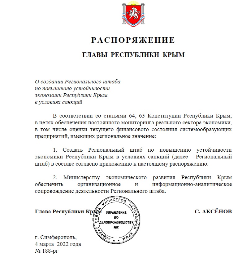 В начале марта российский глава Крыма Сергей Аксенов своим распоряжением создал региональный штаб по повышению устойчивости экономики полуострова в условиях санкций.