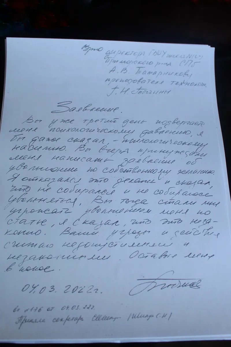 ВРИО директора школы, бывший учитель физкультуры Алексей Татарников потребовал, чтобы Тычина уволился. Тогда Геннадий Николаевич написал заявление, в котором зафиксировал давление со стороны администрации. Документ даже завизировали в школьной канцелярии. Это было 4 марта.