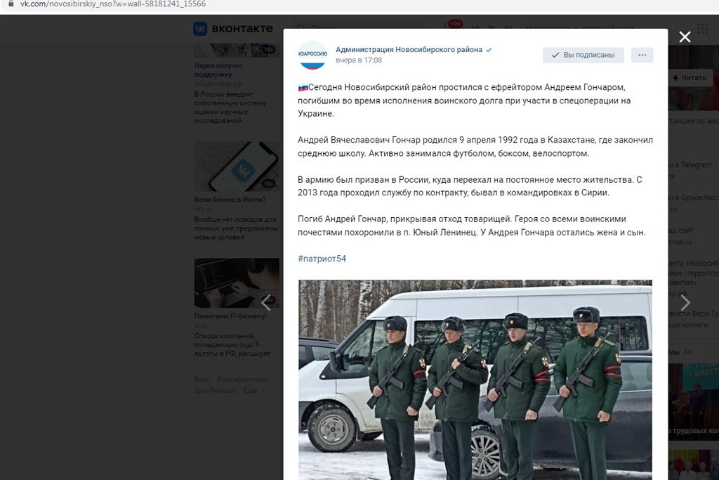 Кроме того, администрация Новосибирского района области объявила о том, что 25 марта прошло прощание с ефрейтором Андреем Гончаром, погибшим при участи в спецоперации в Украине. Он родился в 1992 году в Казахстане, занимался футболом, боксом и велоспортом. У него остались жена и сын.