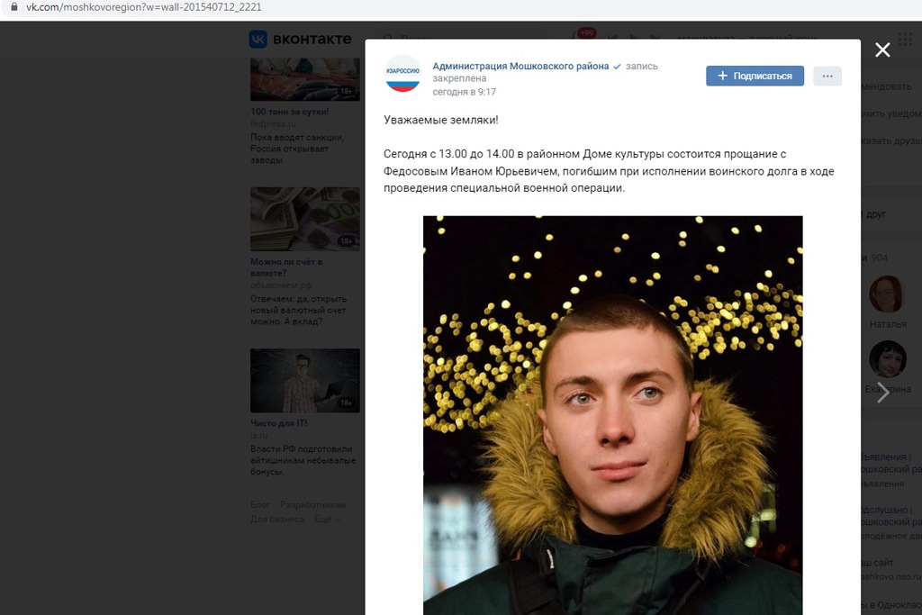 «Сегодня с 13.00 до 14.00 в районном Доме культуры состоится прощание с Федосовым Иваном Юрьевичем, погибшим при исполнении воинского долга в ходе проведения специальной военной операции», — говорится в официальном паблике администрации Мошковского района во «ВКонтакте».