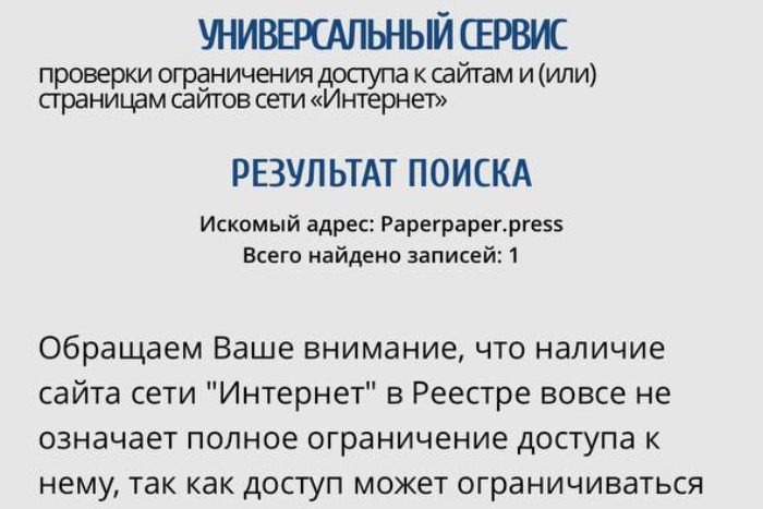 Роскомнадзор внес в реестр запрещенных сайтов зеркало «Бумаги» paperpaper.press. Информация об этом есть на сайтах «Роскомнадзора» и «Роскомсвободы».