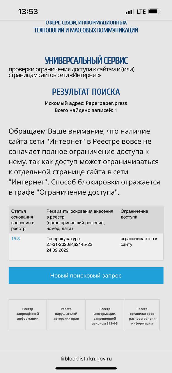Из данных реестра следует, что сайт заблокировали по требованию Генпрокуратуры от 24 февраля — с начала военных действий Роскомнадзор чаще всего ссылается на это постановление. Однако сайт paperpaper.press был запущен только 12 марта, после блокировки основного домена «Бумаги» paperpaper.ru.