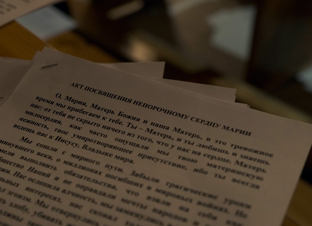 «<…> Народ Украины и народ России, с любовью чтящие тебя, обращаются к тебе с мольбою, твое же сердце бьется за них и за все народы, страдающие от <...>*, голода, несправедливости и нищеты, — сказал Папа по время церемонии посвящению Сердцу. — <…> Твоему непорочному Сердцу, Матерь Божия и наша Матерь, мы торжественно вверяем и посвящаем себя, Церковь и все человечество, особенно Россию и Украину. Призри на сие деяние, что совершаем с упованием и любовью, останови <…>*, обеспечь мир во всем мире. Словами согласия, исшедшими из твоего Сердца, растворились врата истории для Владыки мира, и сегодня мы верим, что через твое Сердце в мир войдет мир. Посвящаем тебе будущее всей человеческой семьи, нужды и чаяния народов, тревоги и надежды мира», — сказал Папа.