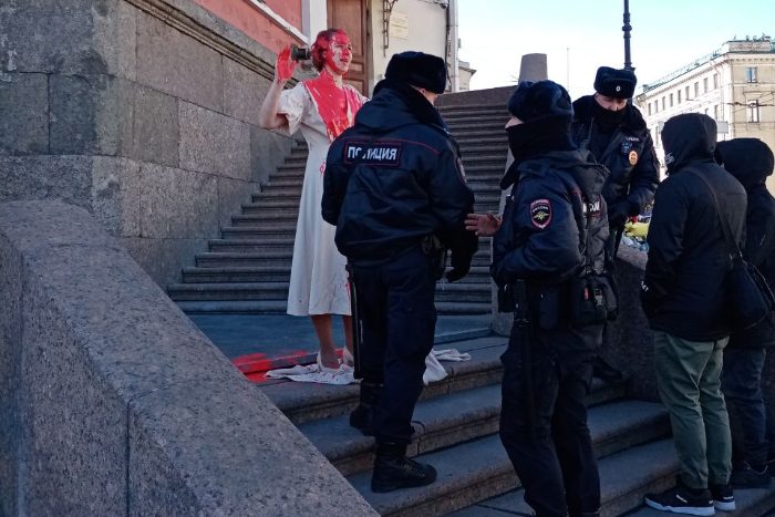 Обновление от 28 марта. Петербурженку и задержанного вместе с ней молодого человека отпустили из отдела полиции. В отношении них составили протоколы о дискредитации вооруженных сил РФ и о нарушении коронавирусных ограничений, сообщают в «ОВД-Инфо».