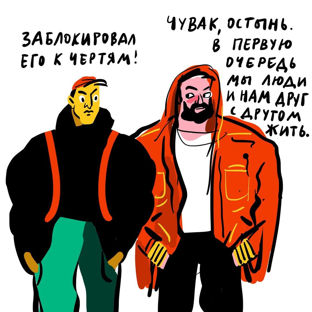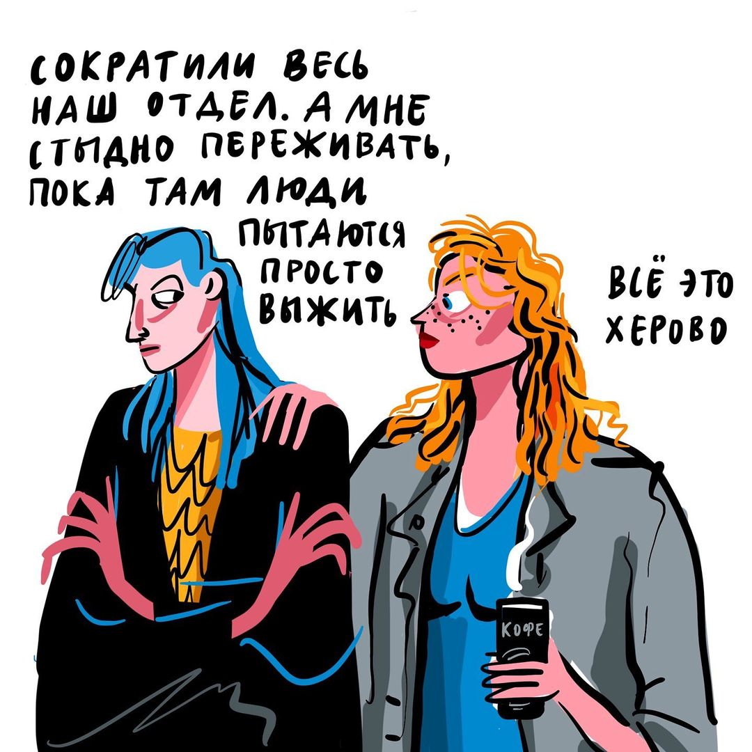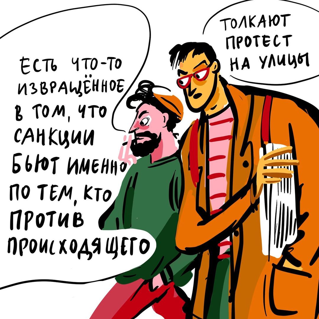 Московская художница, публикующая свои работы под ником evdokeya, создала серию иллюстраций, подслушав на улице разговоры о ситуации в Украине. «Бумага» показывает ее рисунки под общим названием «Хроники конца марта».
