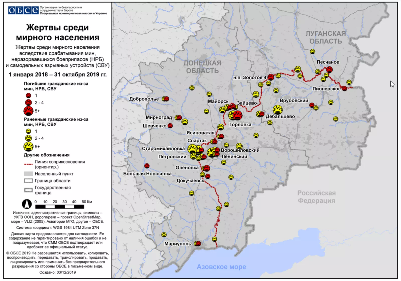 С 2017 года по июль 2020 года мины и неразорвавшиеся боеприпасы стали причиной 312 жертв (53 ребенка) среди гражданского населения — из них 81 мирный житель погиб. Как правило, это случалось «вдоль берегов рек, в полях, во время выполнения сельскохозяйственных работ или сбора хвороста, при попытках пересечь линию соприкосновения на КПВВ и соответствующих блокпостах, а также во время посещений могил родственников на кладбищах вдоль линии соприкосновения». В 150 случаях взрывы были спровоцированы неправильным обращением с опасными предметами или попыткой их разобрать (чтобы получить металлолом и потом продать его, сделать сувениры или из любопытства).