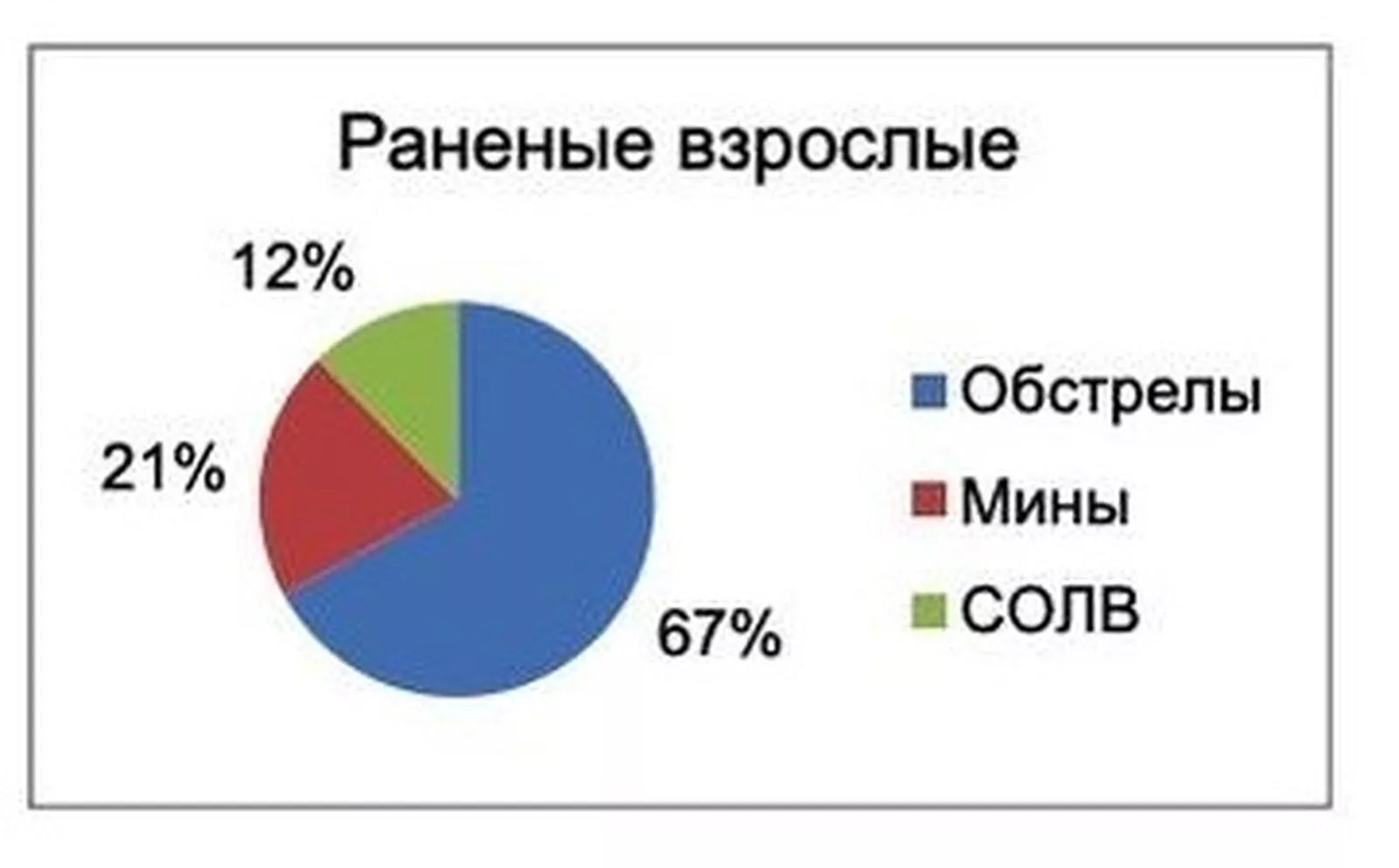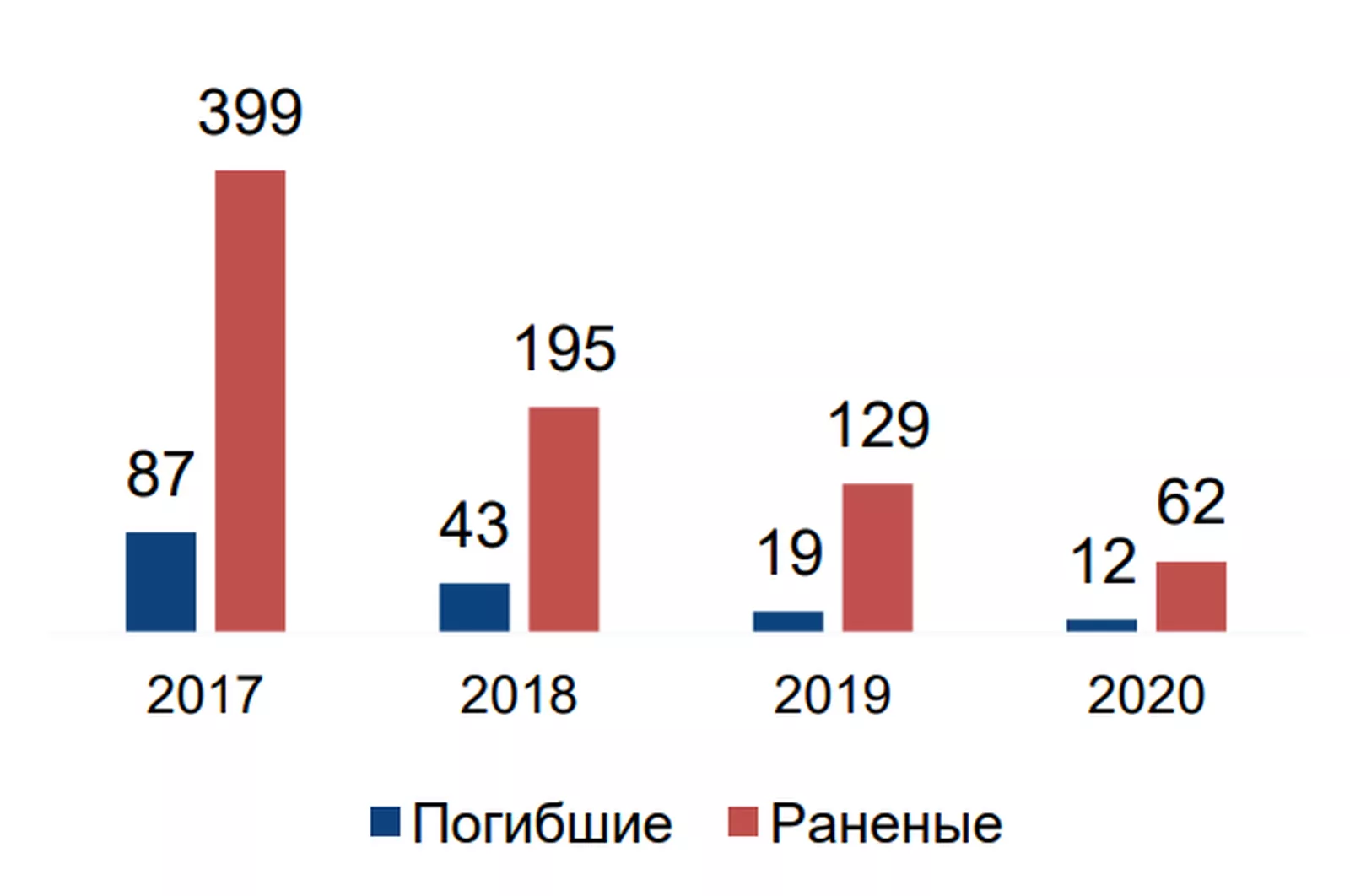 Около 10% всех случаев жертв приходится на третью причину — поражение огнем из стрелкового оружия и легкого вооружения. С 2017-го по 2020-й под эту категории попали 11 погибших и 96 раненных среди мирного населения.