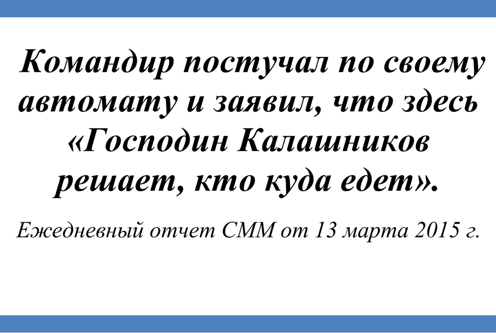 Географически районы, где наблюдался высокий уровень вооруженного насилия, часто совпадали с теми, в которых члены «ДНР» и «ЛНР», а также военнослужащие Вооруженных сил Украины (ВСУ) ограничивали свободу передвижения СММ. Аналогично этому, во многих случаях запрещенное вооружение впоследствии было зафиксировано в местах, в доступе к которым наблюдателям было отказано ранее. До настоящего времени Совместный центр контроля и координации (СЦКК) проявил недостаточную способность обеспечить оперативное реагирование на эти нарушения. Несмотря на успешное решение вопросов в некоторых случаях, часто создавалось впечатление, что СЦКК готов считать нормой ограничения и препятствия в работе СММ. Лица, ответственные за эти нарушения, независимо от их истинных намерений, дали основания для возникновения недоверия, тем самым повышая уровень напряженности и подрывая усилия по обеспечению мира, стабильности и безопасности.