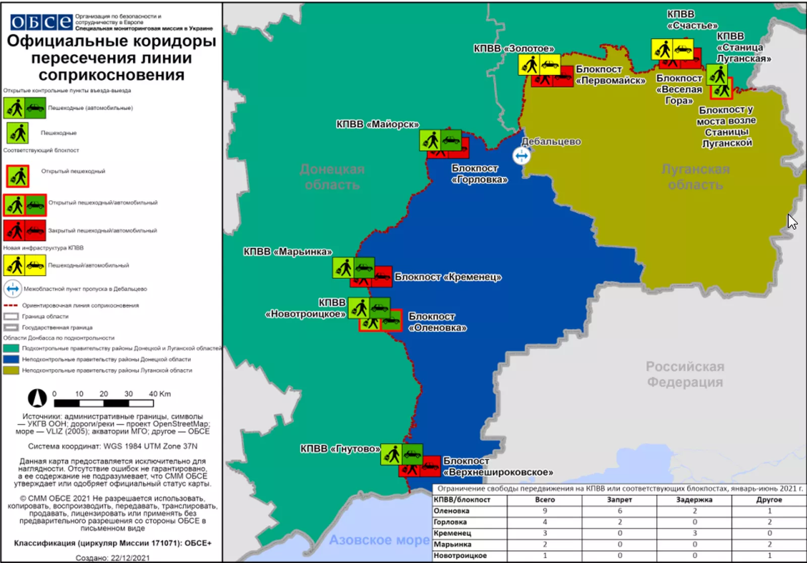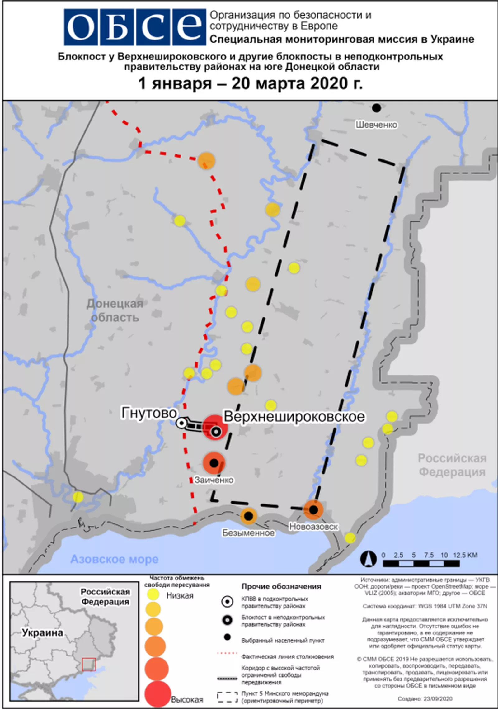 Сотрудники ОБСЕ утверждают , что «по обе стороны от линии соприкосновения был введен ряд мер, которые повлияли на экономические и социальные права гражданского населения. Стороны продолжают игнорировать международные стандарты в области прав человека и нормы обычного международного гуманитарного права, вследствие чего гражданское население подвергается неоправданным страданиям».