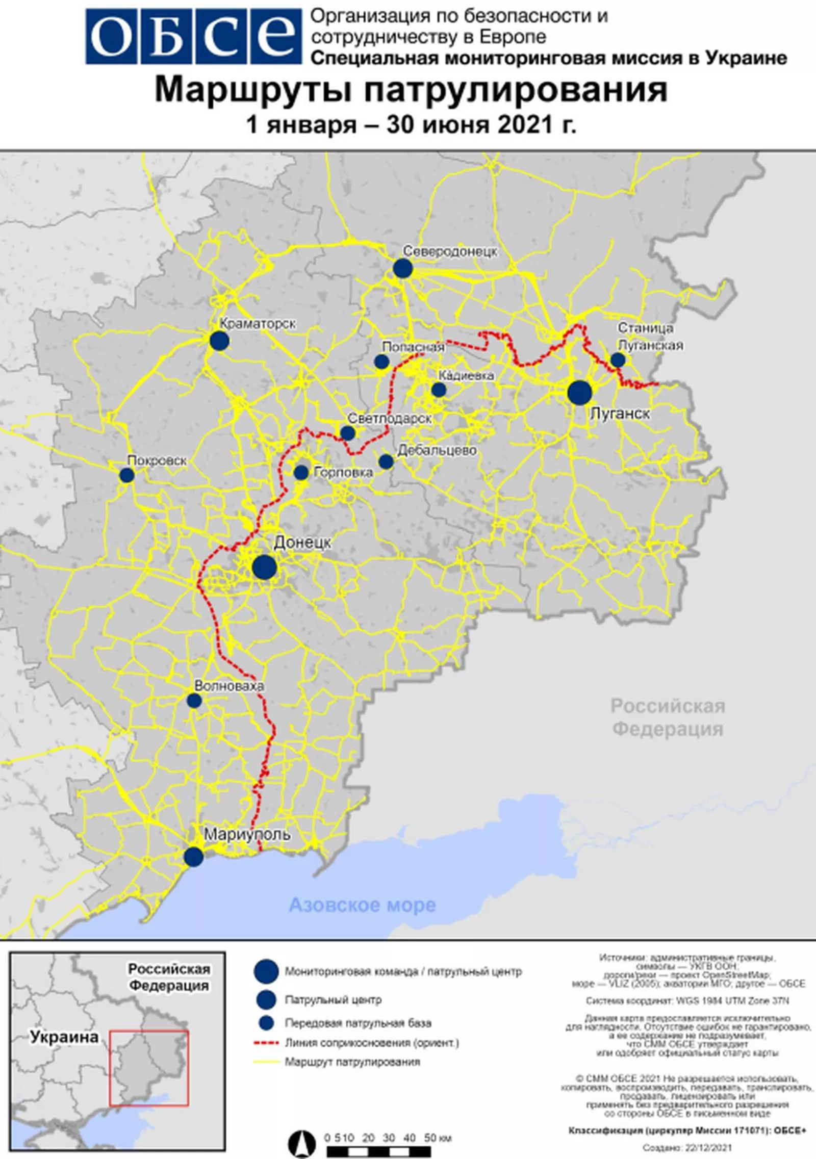 В начале марта 2022 года в Мариуполе неизвестные (стороны конфликта обвиняют друг друга) обстреляли офис специальной мониторинговой миссии ОБСЕ — крупнейшей в мире организации по безопасности. Сожжены два автомобиля, повреждено головное здание, разрушены средства связи — так временно завершилась оперативная работа по мониторингу и урегулированию конфликта в Украине, которая длилась восемь лет.