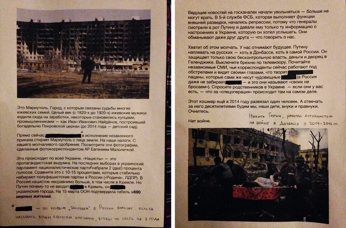 Меньше повезло тем, кто из России не уезжал. Так, к автору «Новой газеты», краеведу Никите Гирину 18 марта пришли с обыском полицейские — за то, что накануне он развесил на доске объявлений в своем родном селе Ижевское Рязанской области фотографии разбомбленного Мариуполя и сопроводил их пацифистским подписями. Гирин рассказывал, что надеялся на сочувствие односельчан, потому что с 1820-х по 1930-е годы предки многих из них ездили в Мариуполь на заработки — эти данные он нашел в архивах. Но сочувствия не нашлось: кто-то из прохожих просто позвонил в полицию и «сдал» Гирина. Сейчас решается вопрос о возбуждении против него уголовного дела «о распространении фейков о вооруженных силах России».