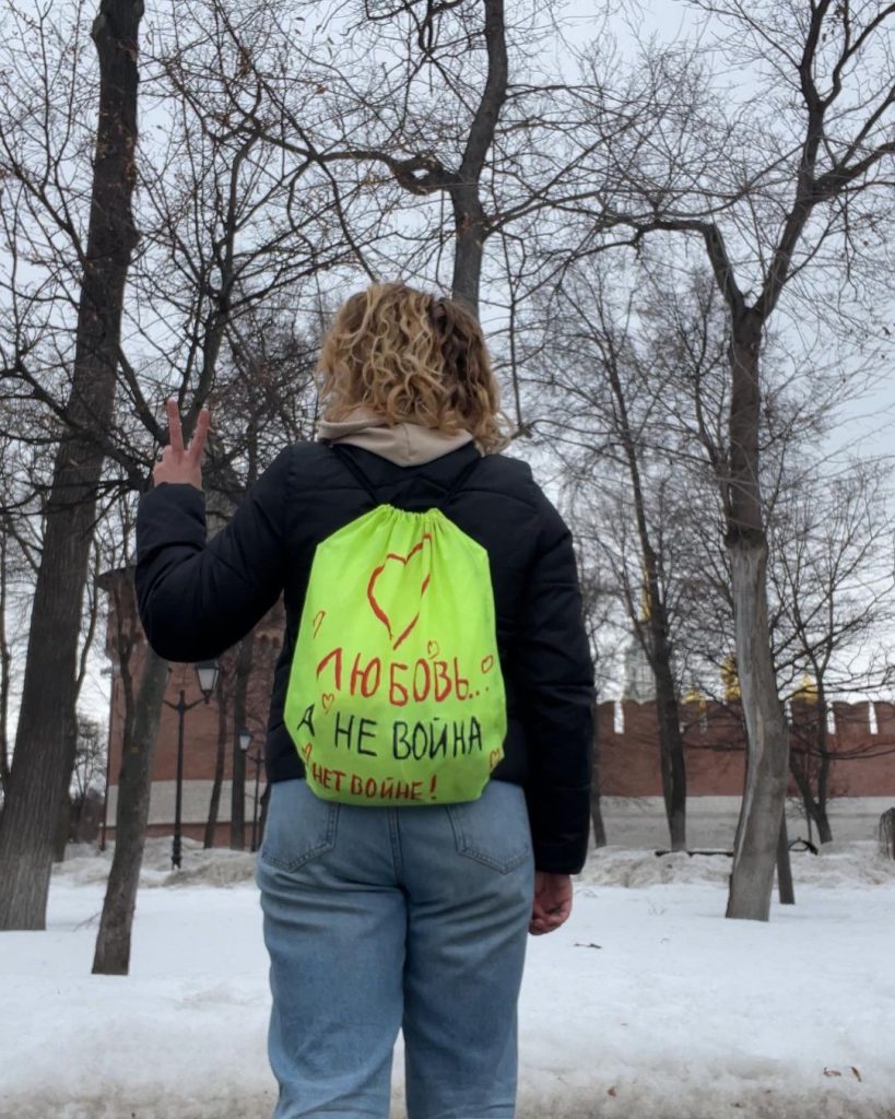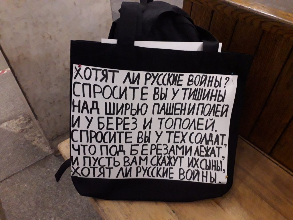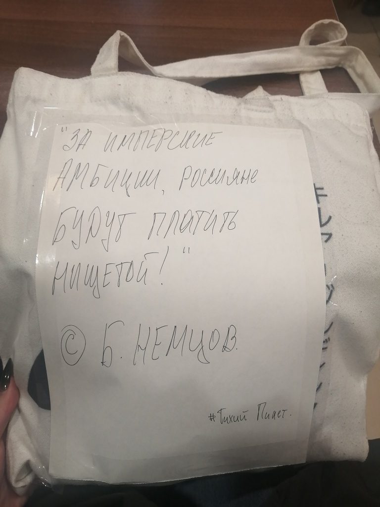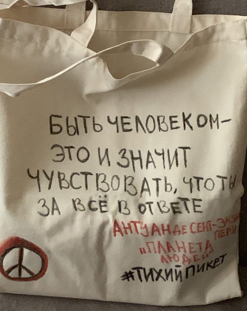 Я решила участвовать, вдохновившись постом «Бумаги», если не ошибаюсь, где были фото активисток, которые придумали «Тихий пикет». Я подумала, что это очень хороший способ обратить внимание прохожих на текущие события и плюс ко всему — меньше вероятность быть задержанной. Реакция окружающих была разной: друзья поддержали, родственники отговаривали участвовать. Сами прохожие ничего мне не говорили, но внимание определенно обращали. Лично я, конечно, немного переживала, выходя на улицу с такой сумкой, много ведь неадекватов. Но для меня приоритетнее говорить правду.