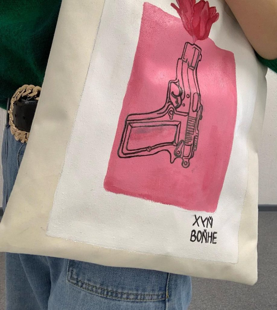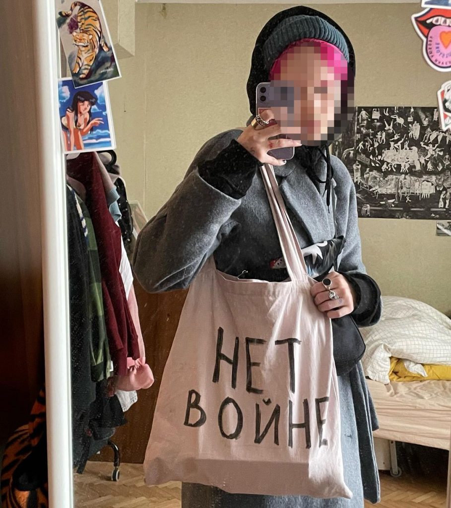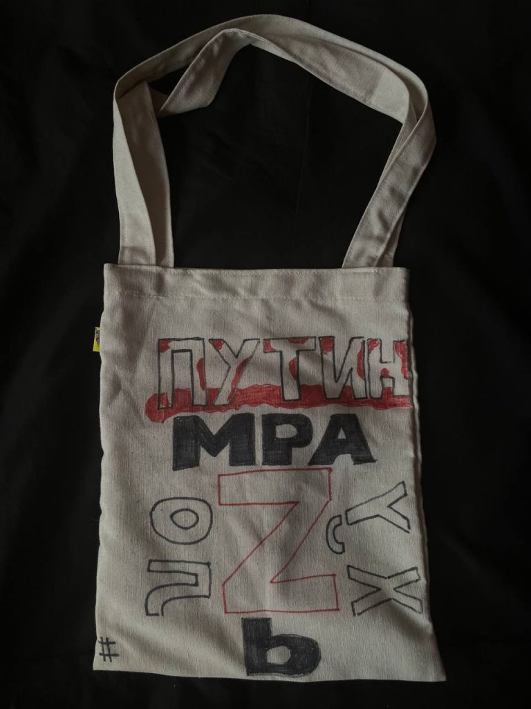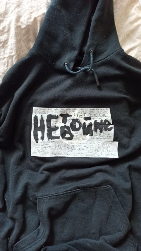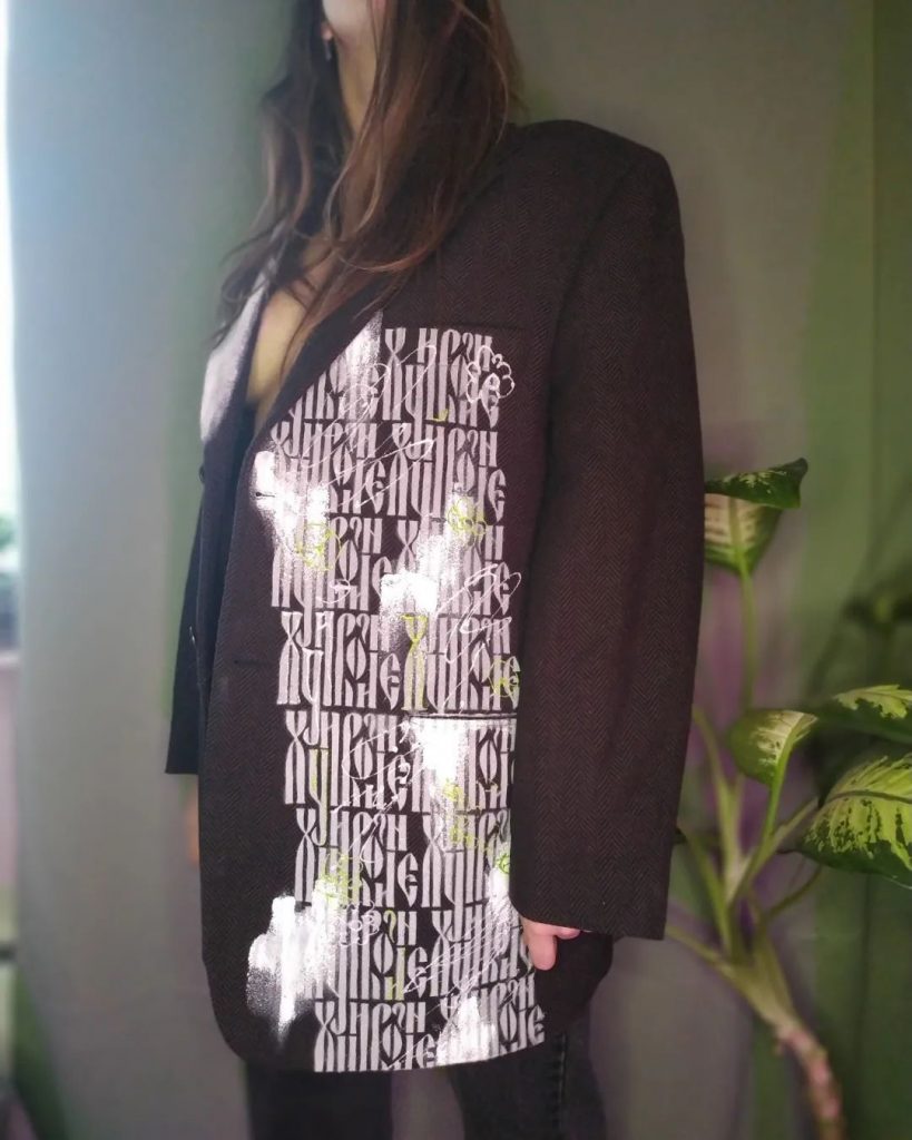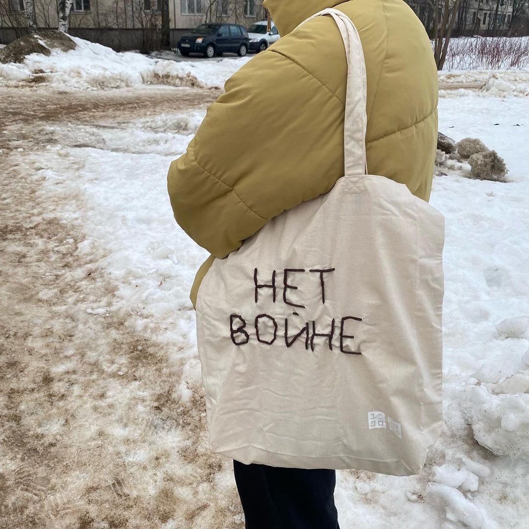 Пиджак с надписью «хуйвойне» я сделала еще до войны, 23 февраля в День защитника Отечества. Было понятно, что нагнетается обстановка, но никто не хотел верить, что война возможна, и эту мысль я и закладывала в надпись. А после подруга попросила написать на шоппере «нет войне». Пока ее за этот шоппер не останавливали — вероятно у правоохранителей сложности с чтением вязи.