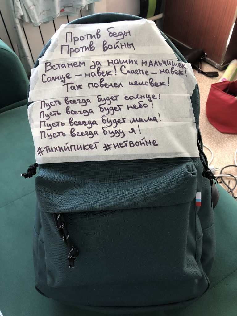Когда я прочитала про «Тихий пикет» в интернете, идея показалась мне интересной и простой, но привлекающей внимание. Я сразу сделала несколько вариантов плакатов и прикрепила к рюкзаку. Единственное — в университете приходится снимать, чтобы не нарваться на проблемы, ко мне уже из-за этого обращался охранник. Но иногда удается проскочить.