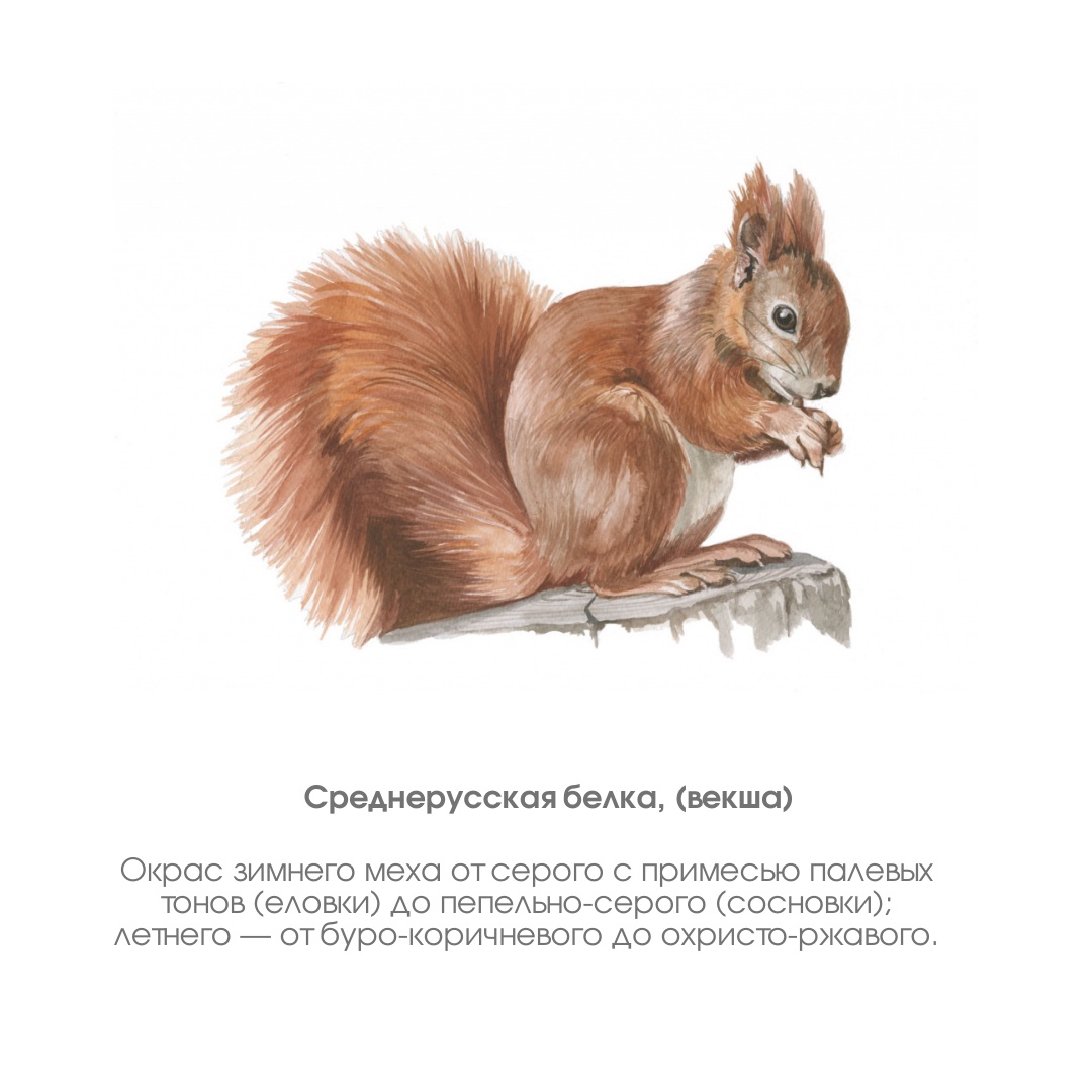 - Белка среднерусская — подвид обыкновенной: ее мех зимой серый, а летом — буро-коричневый или охристо-ржавый.