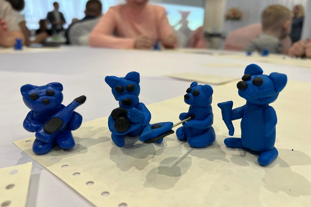 «Ученикам» рассказали об особенностях людей с аутизмом и как себя с ними вести в той или иной ситуации. Каждый из участников слепил из синего пластика медведя Петрушу — символ фонда «Выход», который помогает людям с РАС в России.