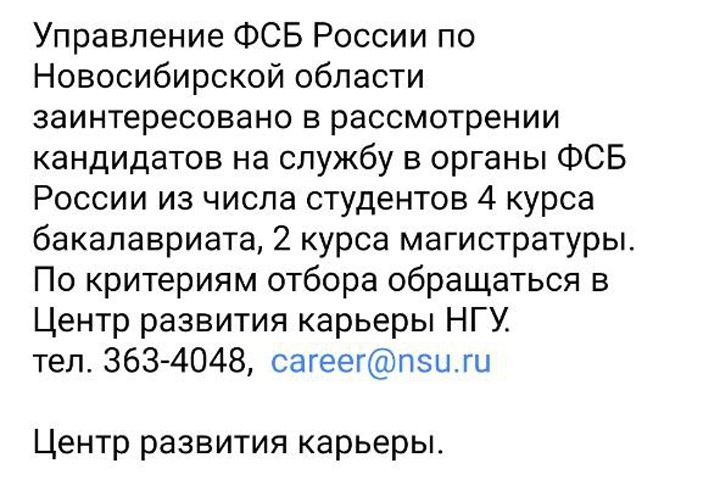 Студенты НГУ получили письмо от центра развития карьеры вуза с приглашением на работу в ФСБ. Ведомство «заинтересовано» в рассмотрении кандидатов среди четверокурсников бакалавриата и второкурсников магистратуры.