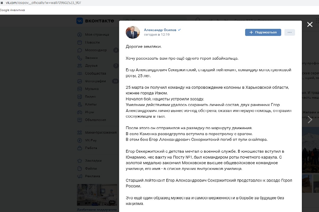 «Хочу рассказать вам про еще одного героя забайкальца. Егор Александрович Секержитский, старший лейтенант, командир мотострелковой роты, погиб от пули», — сообщил на своей странице во «Вконтакте» губернатор Забайкалья Александр Осипов.