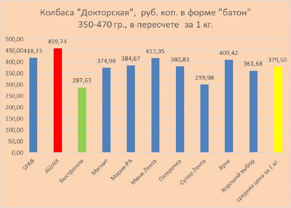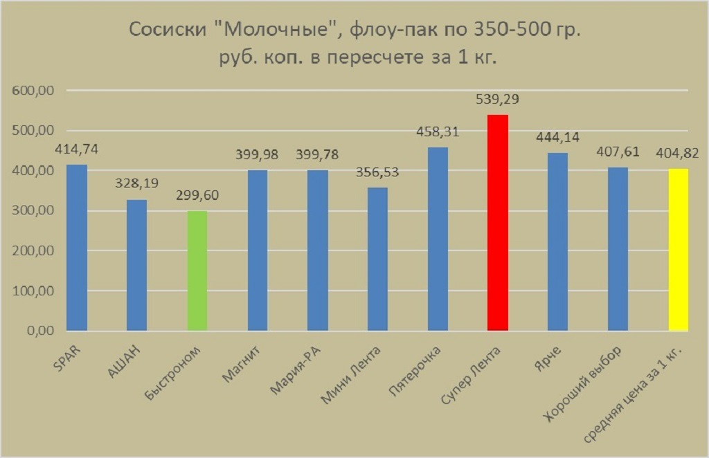 Разница между самой низкой и самой высокой стоимостью килограмма молочных сосисок — 1,8 раза.