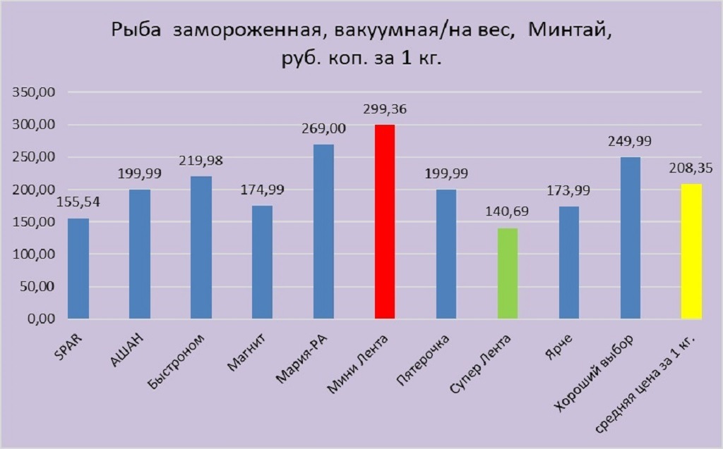 Для мониторинга выбиралась рыба минтай вне зависимости от упаковки и наличия или отсутствия головы. Самый дешевый вариант удалось найти за 140,69 рублей.