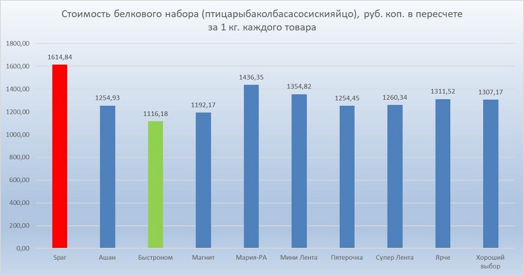 Цены фиксируют в магазинах Spar, «Ашан», «Быстроном», «Магнит», «Мария-Ра», «Мини Лента», «Пятерочка», «Супер Лента», «Ярче» и «Хороший выбор». Принцип выбора товара — самая низкая стоимость.