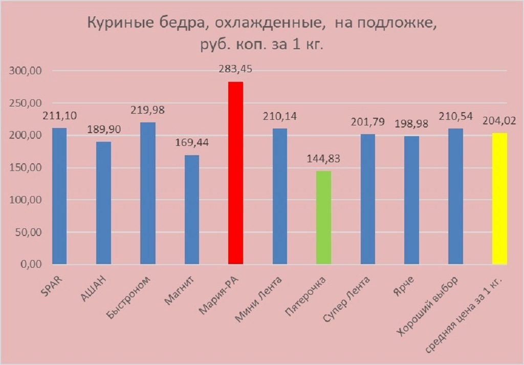 Средняя стоимость килограмма куриных бедер в анализируемых магазинах была 204,02 рублей.