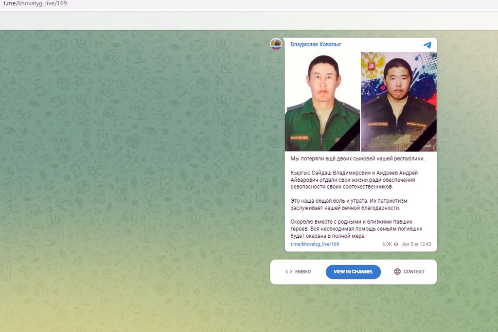 На этом фоне Ховалыг рассказал в своих соцсетях о том, что из республики отправились новые потенциальные участники «спецоперации»: «Сегодня [6 апреля] мы проводили наших добровольцев, которые по зову своего сердца решили оказать помощь жителям Донбасса в зоне боевых действий. <…> Золотой фонд народа Тувы».