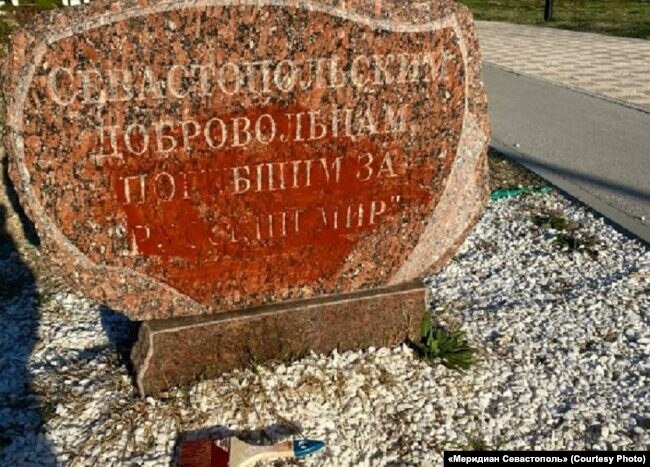 В Севастополе неустановленные лица залили красной краской установленный российскими властями в Парке Победы камень с надписью «Севастопольским добровольцам, погибшим за Русский мир», сообщает издание «Меридиан Севастополь» со ссылкой на местные телеграм-каналы.