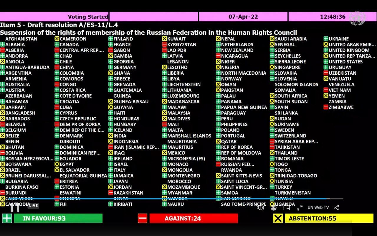 Генассамблея ООН приняла резолюцию о приостановке членства России в Совете по правам человека. Трансляцию вели на сайте организации.