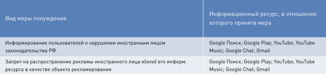 Скриншот с сайта РоскомнадзораФото: портал «Такие дела» Также среди «мер понуждения» Роскомнадзора — запрет на рекламу Google и информационных ресурсов компании.