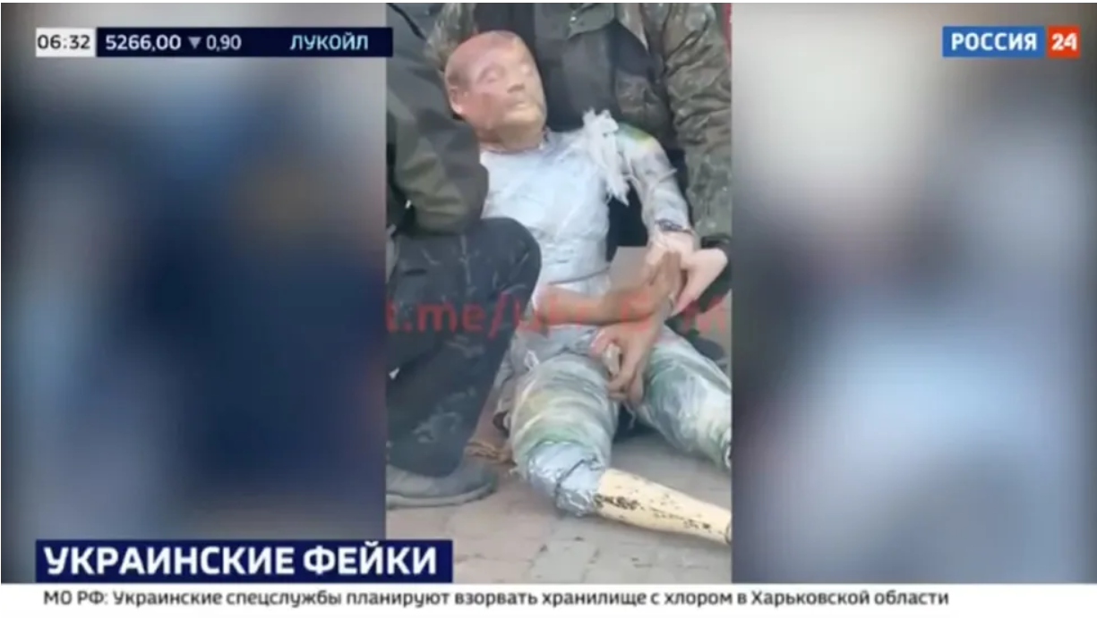 "Так идет подготовка к театру — в прямом смысле этого слова — военных действий на Украине. Как видно, вполне себе незамысловато: двое людей в военной форме тщательно обматывают манекен скотчем и, очевидно, собираются его выдать за труп", - говорит ведущий за кадром.