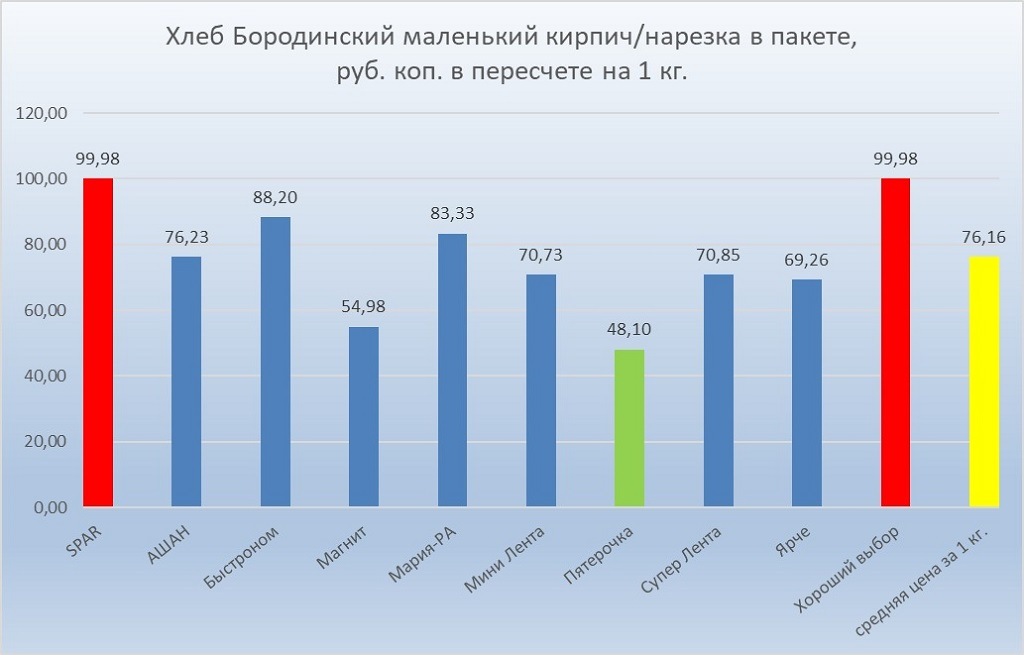 Килограмм «бородинского» хлеба на момент мониторинга в некоторых магазинах стоил почти 100 рублей, но была возможность купить его и вдвое дешевле.