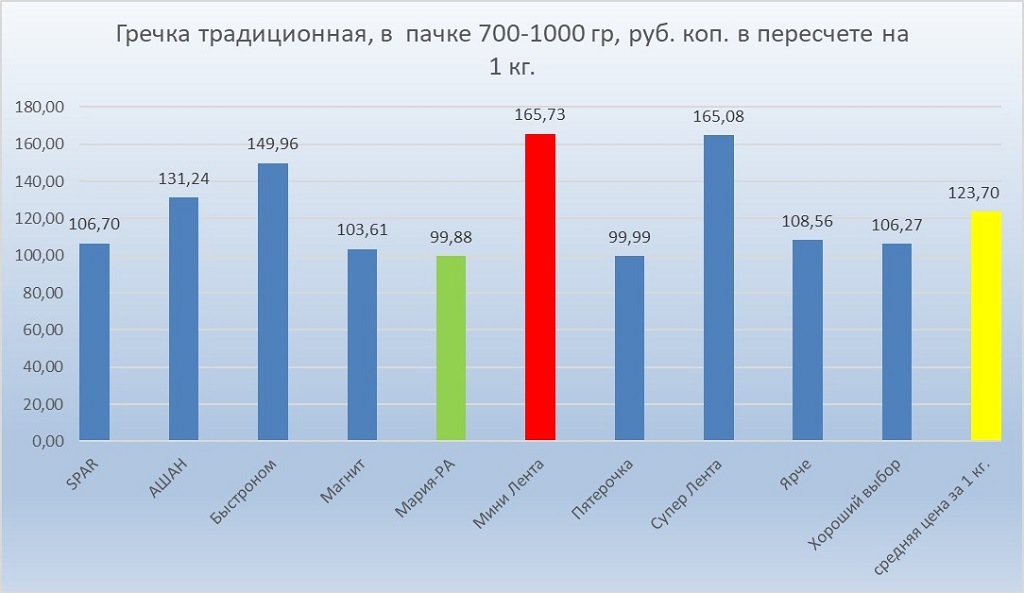 Гречневая крупа в пересчете на килограмм была дороже 100 рублей почти во всех магазинах мониторинга и только в двух чуть ниже этой суммы — 99,88 и 99,99 рублей.