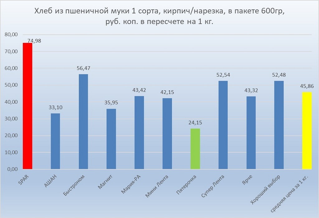 Хлеб из пшеничной муки 1 сорта оказался существенно дешевле «бородинского» — в среднем стоимость килограмма продукта составила 45,86 рублей против 76,16.