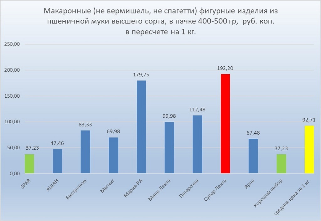 Самый высокий ценник на макаронные изделия во время мониторинга был 192, 2 рублей, наименьший отличался от него в пять раз — 37,23 рублей.