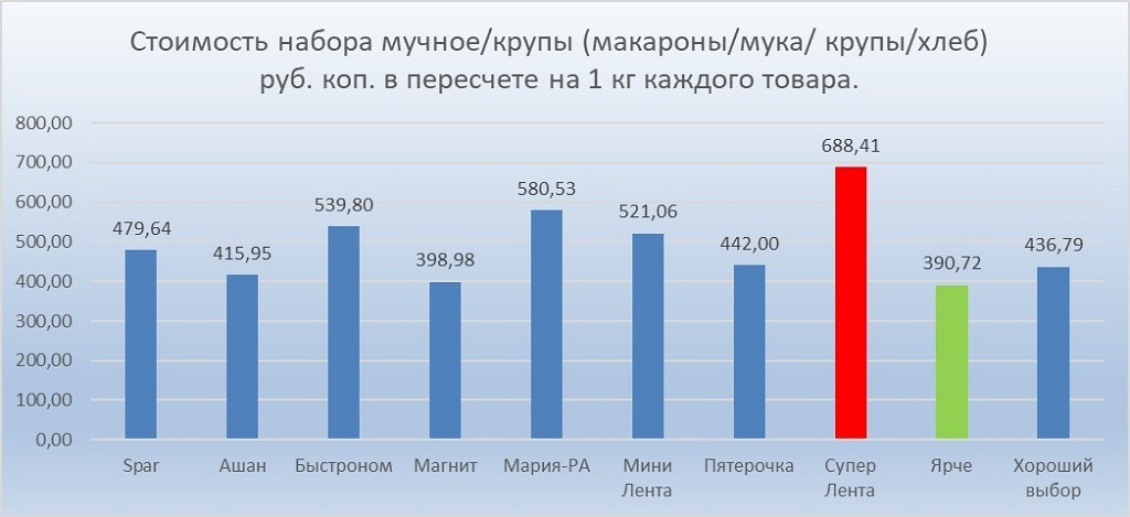 Цены фиксируют в магазинах Spar, «Ашан», «Быстроном», «Магнит», «Мария-Ра», «Мини Лента», «Пятерочка», «Супер Лента», «Ярче» и «Хороший выбор». Принцип выбора товара — самая низкая стоимость в момент мониторинга.