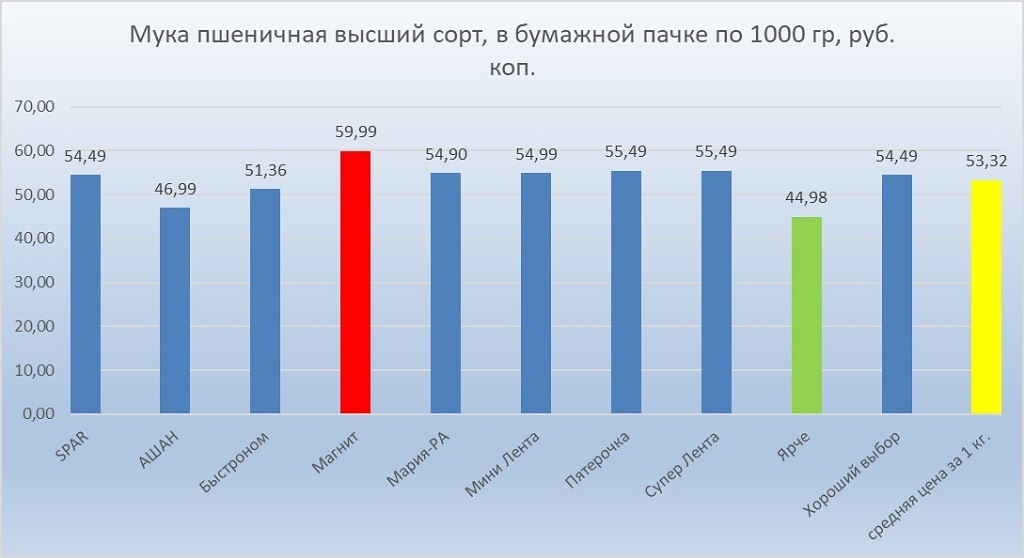 Наименьшая стоимость килограмма пшеничной муки высшего сорта была зафиксирована на уровне 44,98 рублей.