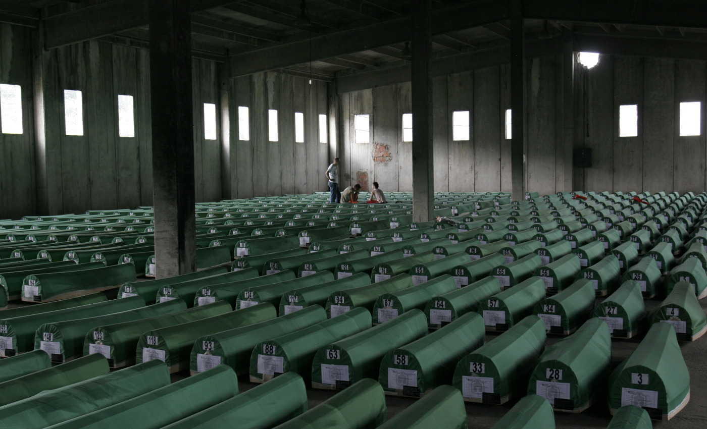 Боснийские мусульмане возле гробов жертв Сребреницы в мемориальном центре Потокари, 10 июля 2007 года. Фото: Amel Emric / AP