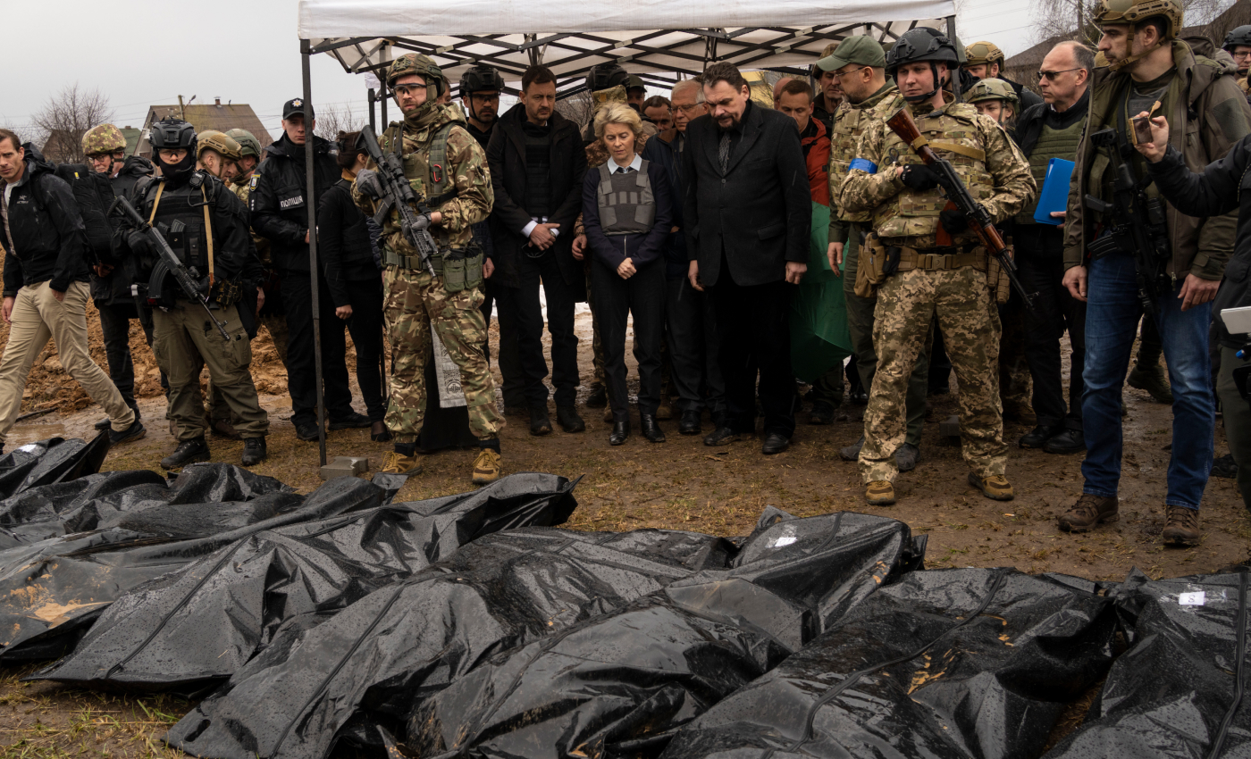 Председатель Комиссии ЕС Урсула фон дер Ляйен смотрит на накрытые тела убитых мирных жителей в Буче, 8 апреля 2022 года. Фото: Rodrigo Abd / AP