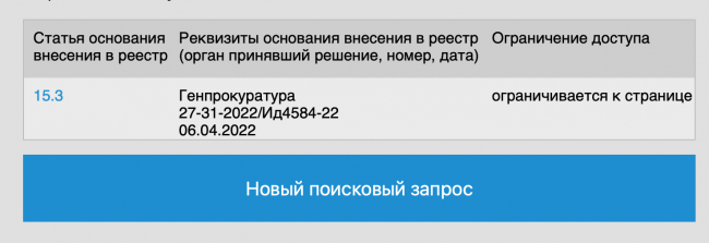 Согласно информации на сайте Роскомнадзора, решение о блокировке было принято 6 апреля по запросу Генеральной прокуратуры.