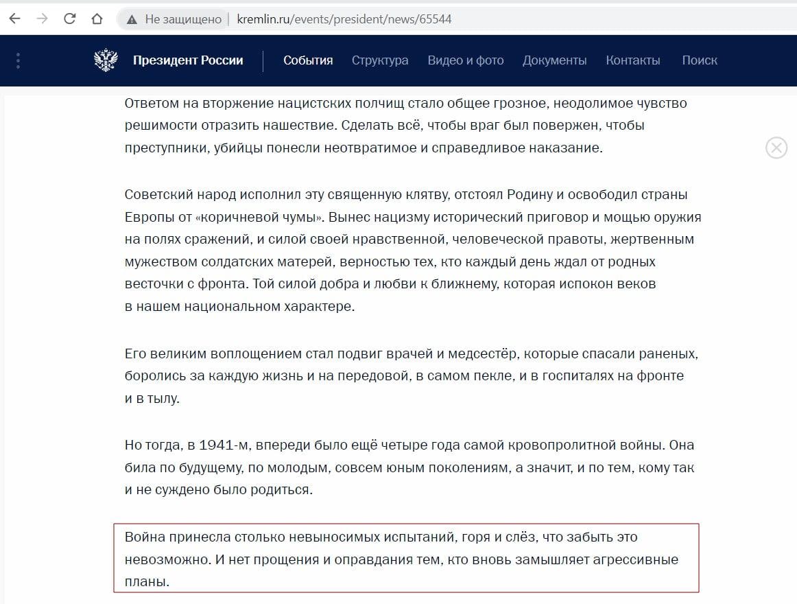 Точно такие же слова сказал Владимир Путин, когда выступал на Параде Победы 9 мая 2021 года. Расшифровка его выступления доступна на сайте Кремля, там же есть видео.