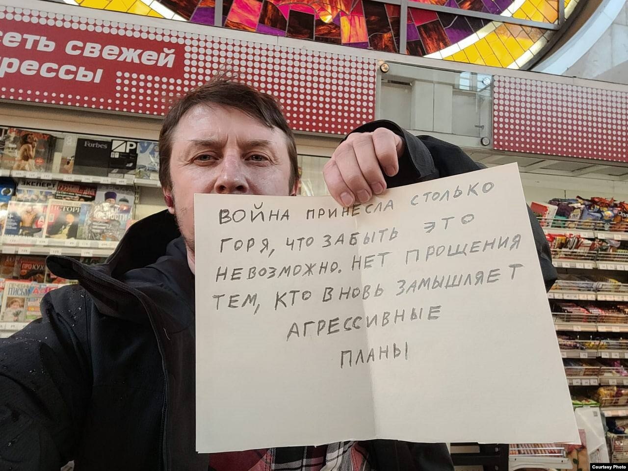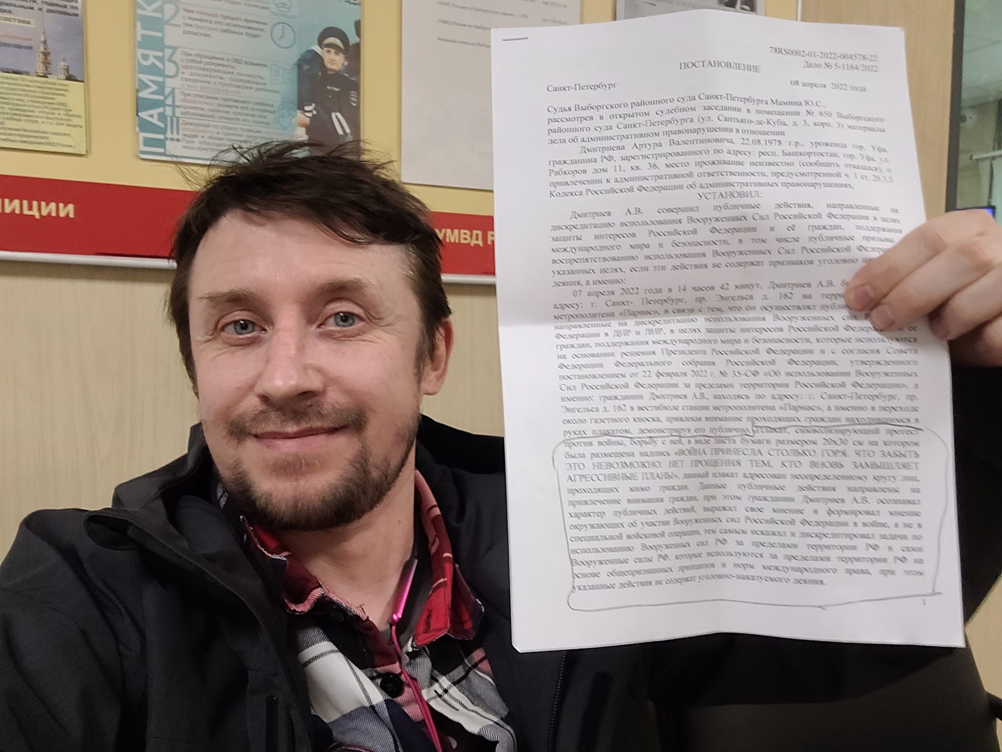 В Петербурге суд оштрафовал 43-летнего Артура Дмитриева на 30 тысяч рублей за то, что он стоял в метро с плакатом, на котором была антивоенная цитата президента Владимира Путина. Дмитриев считает, что "шалость удалась", поскольку он заставил суд признать слова президента "дискредитацией Вооруженных сил России". Корреспондент Север.Реалии узнал у Дмитриева, почему он выходит на акции протеста и не будет обжаловать решение.