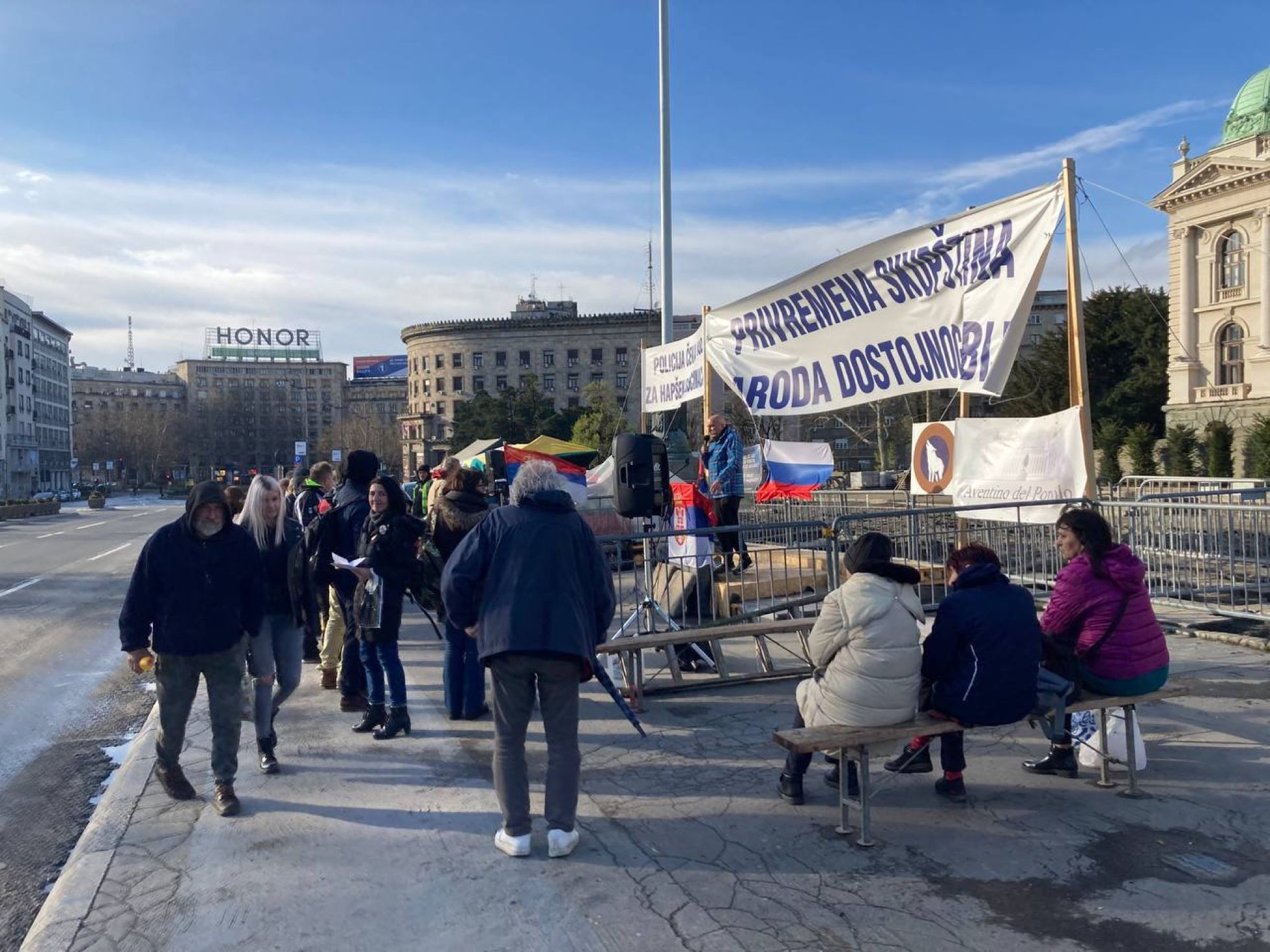 На тротуаре напротив здания парламента стоят несколько палаток, а на небольшой сцене рядом постоянно кто-то выступает перед немногочисленными зрителями. Над помостом висят сербский и российский флаги. Когда я пришел узнать, что же все-таки тут происходит, со сцены вещал харизматичный мужчина с большими усами. Общий смысл его речи понять было сложно, но отдельные слова я узнавал: «Хаос, катастрофа, свобода, заслуга предков, великий братский народ, истина, НАТО, Россия и Украина».