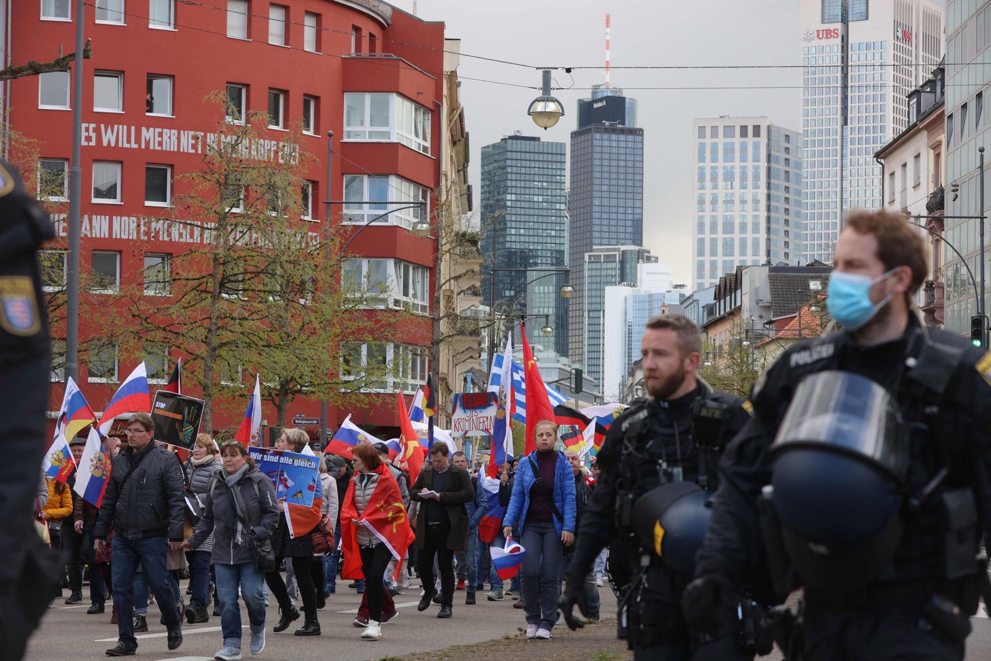 Когда 10 апреля в центр Франкфурта-на-Майне вышли около 800 демонстрантов с российскими флагами, им противостояли примерно 2500 проукраинских демонстрантов. «Полицейские окружили людей с советскими, российскими и казахстанскими флагами. А вокруг этого кольца — толпа, которая кричит про фашистов и русский корабль, ругается и бьет в барабаны», — так описывает акцию во Франкфурте поехавший туда Алексей Шварц.