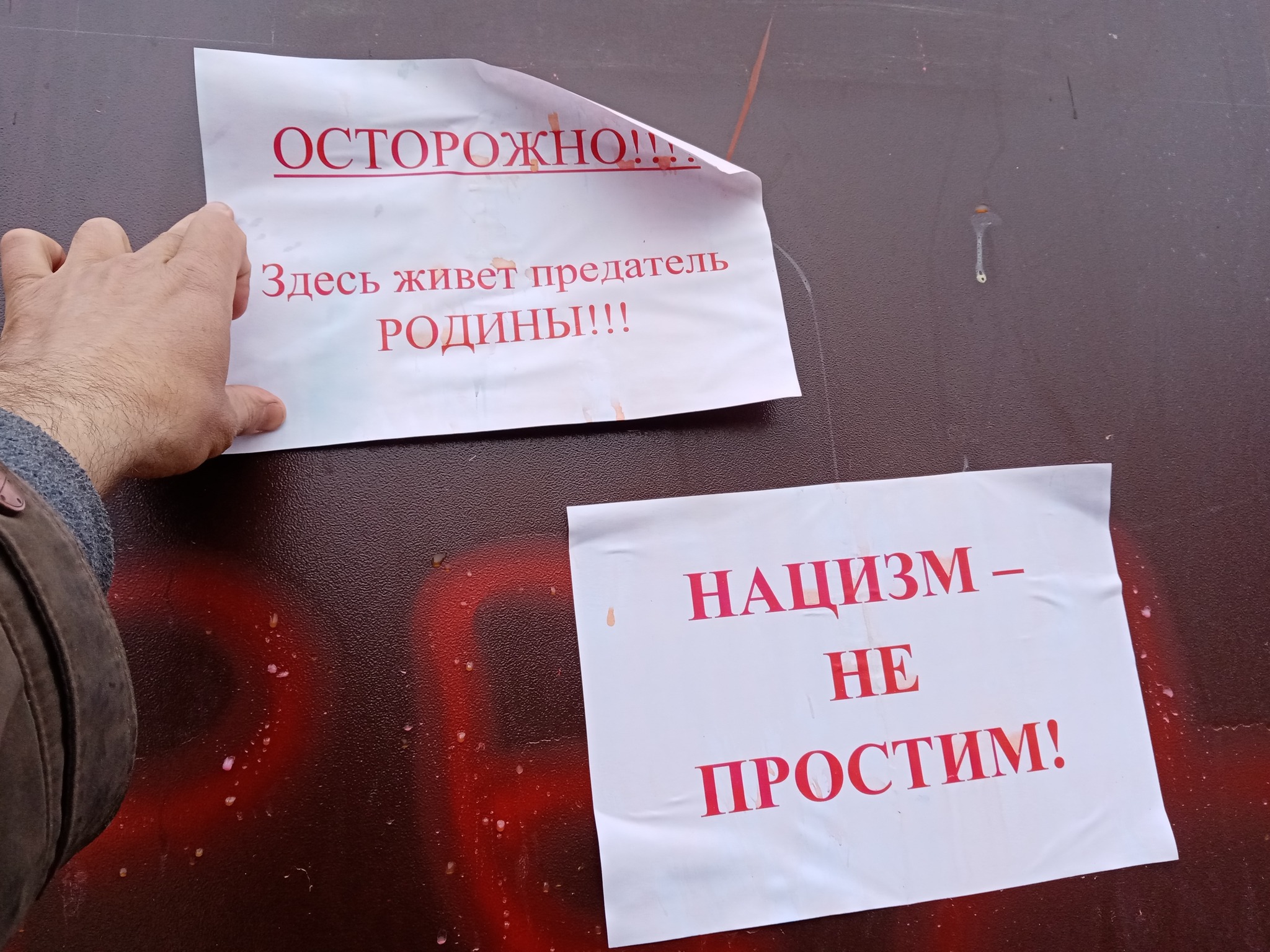 Надпись "предатель" также сегодня ночью появилась на дверях квартир у двух петербургских активистов Асана Мумджи и Ольги Смирновой. Неизвестные оставили после записки с угрозами и навоз.
